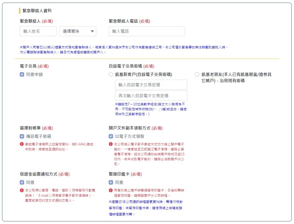 凱基期貨線上開戶Step7:填寫緊急連絡人及自設密碼,若已有凱基帳戶請選擇『凱基老朋友』沿用舊密碼