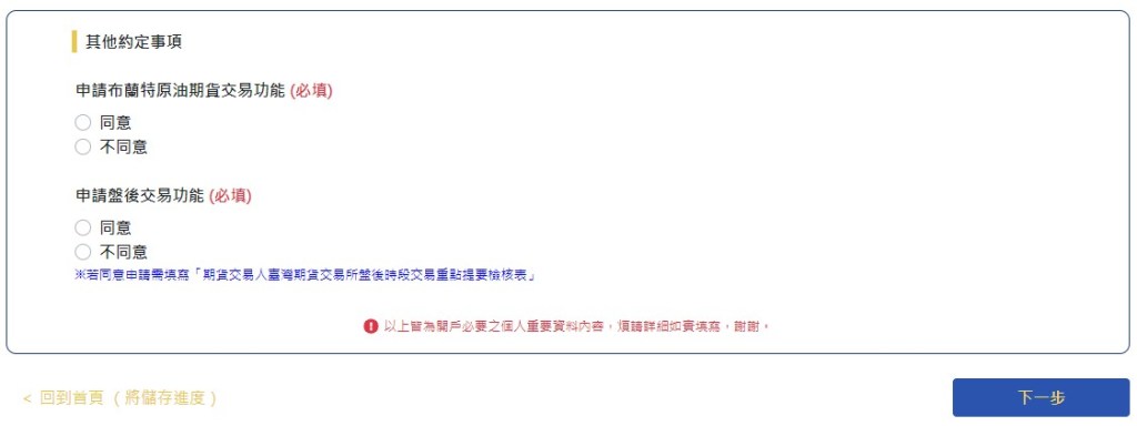 ✦線上開戶第五個步驟共有18個 ✔要確認,如開戶過程因網路異常未能完成期貨線上開戶申請,可以嘗試重新整理線上開戶網頁,登入繼續完成期貨線上開戶申請。