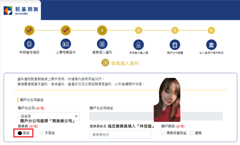 凱基期貨線上開戶Step5:開戶分公司:期貨總公司 指定營業員:林佳璇