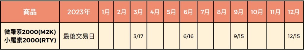 ANS:微型羅素2000指數期貨是季月合約、現金交割商品,每個季月有三個連續月份可以交易,微型羅素2000指數期貨結算日是合約結算當月的第三個週五。(TIPS:與其他指數期貨同天結算)