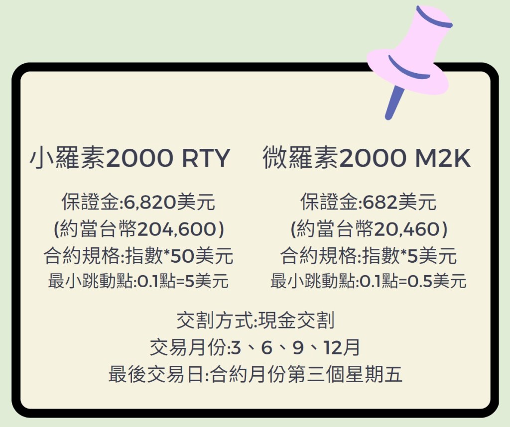 ANS:微型羅素2000指數期貨保證金目前是682美金(2023年4月),約當台幣約20,460元(依期交所公告為主)。