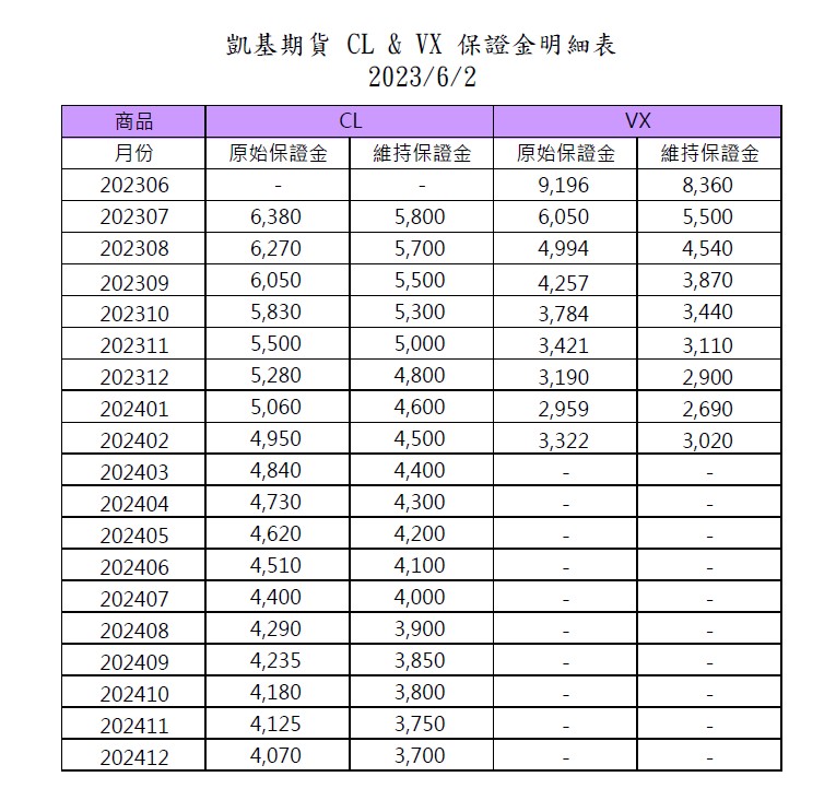 ◈[參考]2023/06/02輕原油及波動率指數期貨保證金明細表